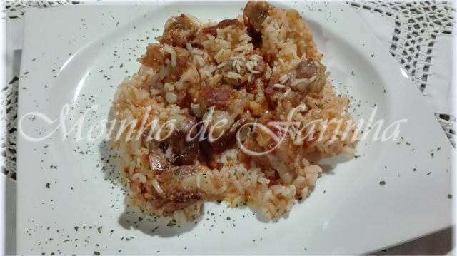 Leva os alhos e a cebola a refogar num tacho com um pouco de azeite... Acrescenta a polpa de tomate , o entrecosto e um pouco de vinho branco. Deixa cozinhar por algum tempo e depois acrescenta um pouco de água. Deixa a carne estufar e acrescenta depois o arroz e água (em dobro do arroz). Mexe tudo e depois coloca num refratário de vidro para levar ao forno a 180ºC (por cerca de 15 minutos, ou até estar pronto)... Depois de pronto, polvilha com a salsa e está pronto a servir.