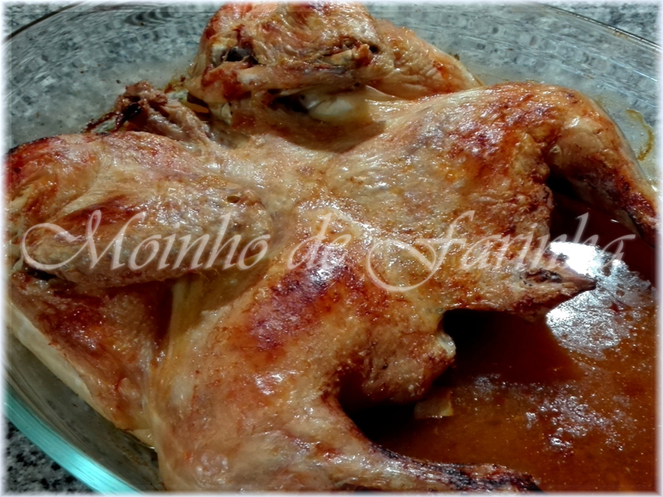 Na hora de ir ao forno, tempera com piri-piri, um fio de azeite e refresca com vinho branco. Leva ao forno (pré-aquecido a 180 º C) até estar assado.