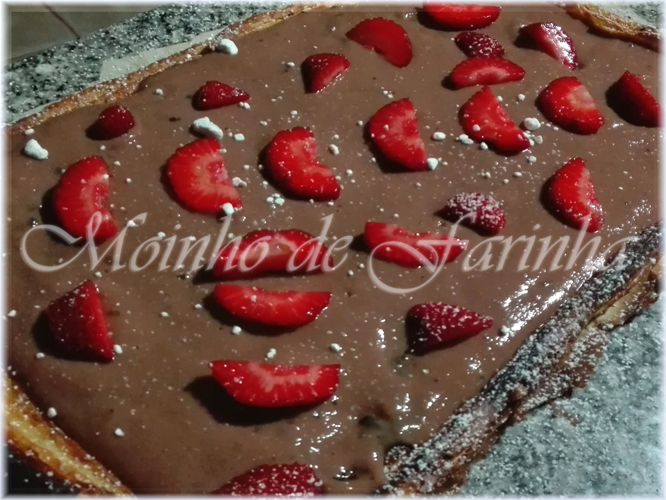 - Corta, em cada um dos quatro lados da massa folhada, uma tira fina para ser colocada nas margens da tarte e ser usada como um "alto" ou uma "barreira" para o creme, e depois corta novamente ao meio (em comprimento) cada uma dessas tiras. Pincela as margens da massa folhada com água (para "colar" a massa) e colocas as primeiras tiras (duas a duas - paralelamente). Pincela-as também com água para colocares as restantes tiras de massa sobre estas. Faz os acertos, retirando os excessos de massa que se extendam para além da forma retângular com a ajuda de uma faca.
