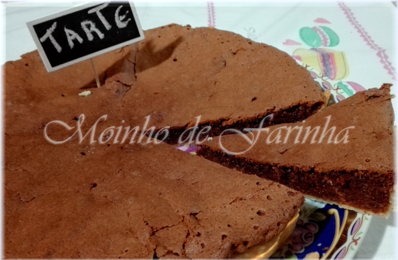 Numa batedeira, bate os ovos com o açúcar amarelo. Acrescenta o chocolate (derretido com a manteiga) e bate mais um pouco até que fique bem misturado... Depois, acrescenta e envolve (com uma colher) a farinha com o fermento. Depois de bem envolvido, verte essa massa sob a placa de massa quebrada na tarteira e leva ao forno* por cerca de 35~40 minutos (ou até estar pronta)...