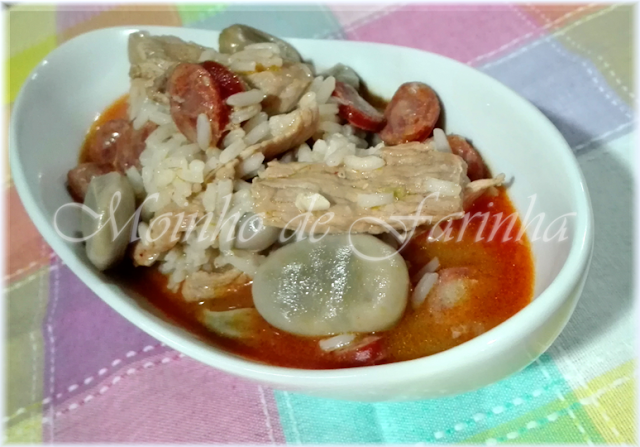 Num tacho, faz um refogado com o azeite, o alho e a cebola. Junta todas as carnes e envolve-as no refogado. Tempera com o pimentão doce, mexe e deixa cozinhar à temperatura máxima por alguns minutos - sem tampa. Depois reduz o lume (temperatura) para o mínimo e coloca a tampa no tacho, mexendo de vez em quando... Quando estiver quase sem molho, acrescenta a água e as favas. Deixa ferver antes de acrescentar o arroz (devido ao fato das favas serem congeladas)... Tempera com sal e deixa que arroz fique cozinhado...