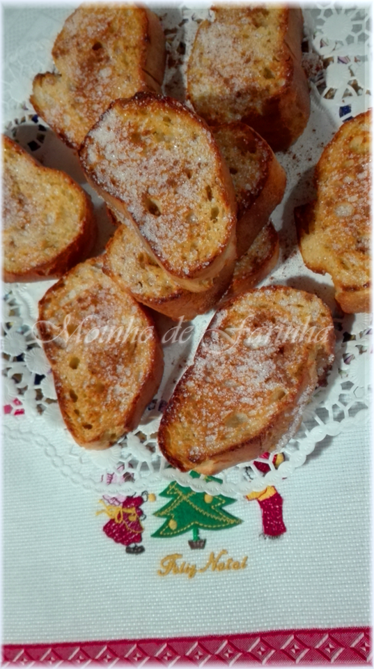 Bate os ovos com o leite condensado e os ovos. Depois, mergulha lá as fatias de baguete e coloca-as num tabuleiro untado com manteiga (usei dois tabuleiros - 5 em cada). Leva-as ao forno pré-aquecido a 180ºC por cerca de 30 minutos. Posteriormente passa-as por uma mistura de açúcar com canela...