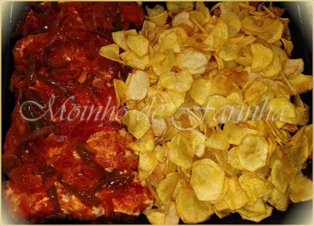 Num tabuleiro de ir ao forno, coloca as postas de bacalhau e barras com maionese (de um lado do tabuleiro - o outro lado é para as batatas fritas). Acrescenta a cebolada... Leva ao forno até ficar dourado...