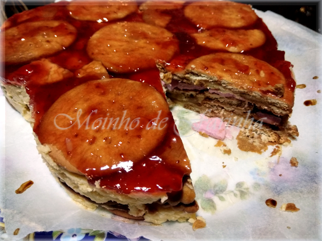 [*poderão fazer sem estas bolachas já que o doce usado na "cobertura" acaba por dar todo o suficiente sabor a "morango"]