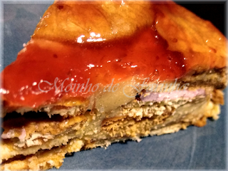 Por cima, coloca doce de morango (aquecido uns segundos no microondas)...