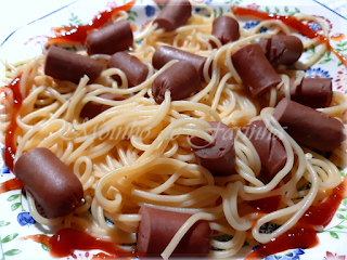 Quando a água estiver a ferver, junta o esparguete com as salsichas... Deixa o esparguete cozer até ficar "al dente" e depois escorre... Servi acrescentando também um pouco de ketchup (picante).