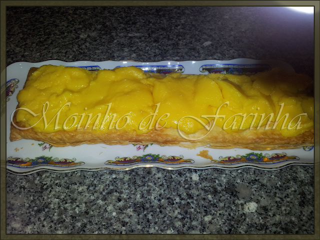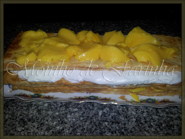 Coloca o primeiro bolo num prato. Barra por cima com o recheio e, por cima do recheio, o creme.