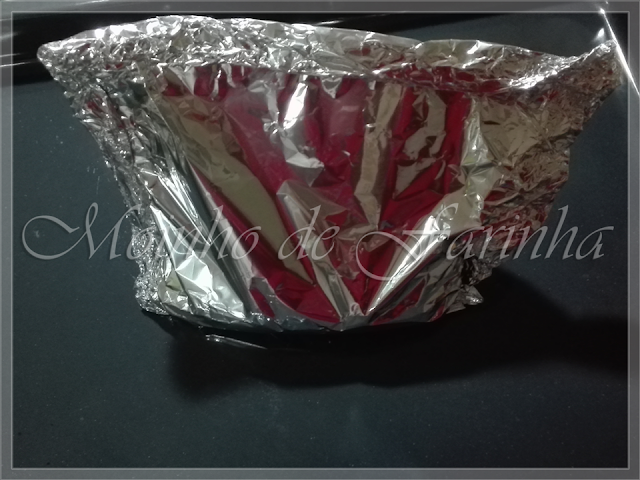 Ergue e junta as quatro pontas do papel-alumínio fechando-o em forma de um pequeno saco (como se pode ver nas imagens), alto e com espaço, para que dessa forma a que todos os temperos se mantenham lá dentro. Leva ao forno por dez minutos...