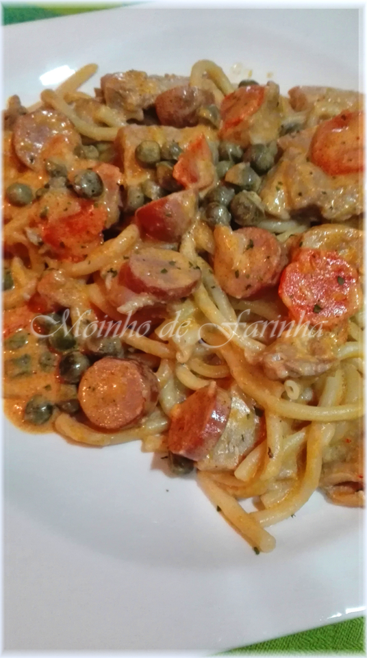 Num outro tacho, leva a cebola e o alho a refogar em azeite. Depois da cebola lourar, acrescenta as carnes. Deixa fritar um pouco,  e acrescenta as ervilhas e a cenoura. Junta a polpa de tomate, sal e orégãos. Deixa cozinhar... Depois, acrescenta as natas e mistura bem. Por fim, acrescenta a massa meada ao tacho e envolve-a bem com o seu molho. Ao servir, polvilha com salsa picada.