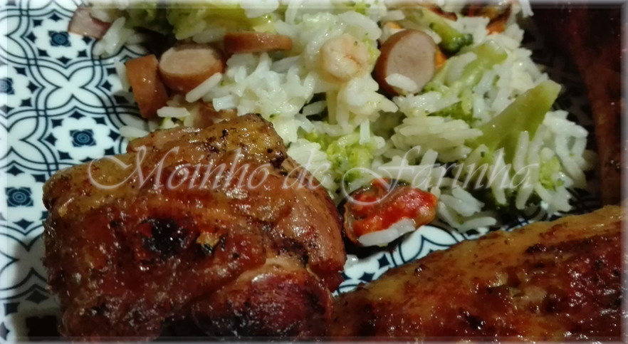 Refoga a cebola, o bacon, as salsichas, o camarão e o mexelhão no azeite. Junta a água, e assim que água ferva junta os brócolis. Assim que comece a ferver novamente junta o arroz e tempera com sal e pimenta. Mexe e deixa acabar de cozinhar...